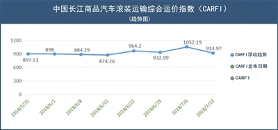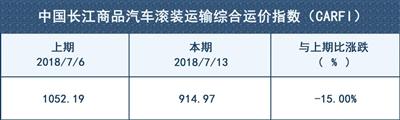 本周中国长江商品汽车滚装运输综合运价指数(CARFI)较上期降15%,为914.97点。