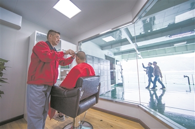 “我基本上每两个月就要来理发一次,这个习惯已经维持快一年了。”正在请“水上发型设计师”王士兵师傅帮忙理发的船员,对着面前的大镜子,稍低着头对记者说。在王师傅的精心修剪下,一个个忙碌了一天的船员都变得精气神十足。