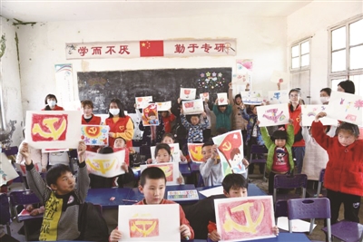 小朋友们也显得十分融入与兴奋。在绘画课上,由于单个课堂的课桌不足,一些同学就跪在地上,在椅子上认真地画着。课程结束时,全体小朋友举起的一幅幅党旗画作,就像举起了他们人生的火热未来。