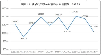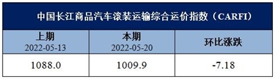 本期中国长江商品汽车滚装运输综合运价指数(CARFI)为1009.9点,较上期下跌7.18%。