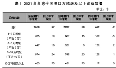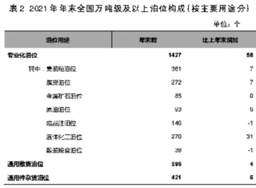 年末全国港口万吨级及以上泊位2659个,比上年末增加67个。从分布结构看,沿海港口万吨级及以上泊位2207个、增加69个,内河港口万吨级及以上泊位452个、减少2个。从用途结构看,专业化万吨级及以上泊位1427个、增加56个,通用散货万吨级及以上泊位596个、增加4个,通用件杂货泊位421个、增加6个。