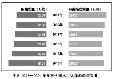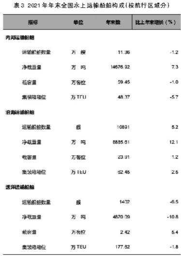 年末全国拥有水上运输船舶12.59万艘,比上年末下降0.7%,其中净载重量28432.63万吨、增长5.1%,载客量85.78万客位、下降0.3%,集装箱箱位288.43万标准箱、下降1.6%。