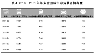 年末全国拥有城市公共汽电车70.94万辆,比上年末增长0.7%,其中纯电动车41.95万辆、增长10.8%,占整个城市公共汽电车比重为59.1%、提高5.4个百分点。拥有城市轨道交通配属车辆5.73万辆,增长15.9%。拥有巡游出租汽车139.13万辆,下降0.2%。拥有城市客运轮渡船舶196艘,增长1.0%。