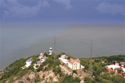 大连市旅顺口区老铁山岬角素有“京津门户,黄渤海咽喉”之称,黄海、渤海的浪潮从海角两边涌来,不同颜色的海水在这里交汇成一条美丽的分界线,形成了“一山担双海”的独特景观。