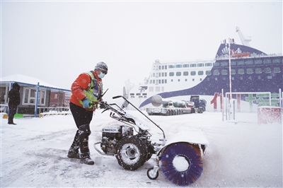 图为烟台港客运站滚装安检厅外,工作人员用除雪机清除积雪,保障车辆登船通道畅通无阻。张超 摄