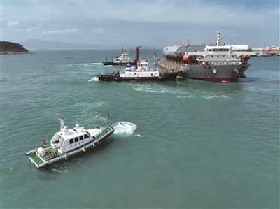 日前,在漳州海事局精心监护下,大件运输船“江海骏驰”轮安全靠泊古雷港区(如图)。该轮载运的洗涤塔,以109米总长、10.2米最大直径、2465吨总重的超限体量,刷新了全球同类型设备的纪录,堪称“大国重器”。
