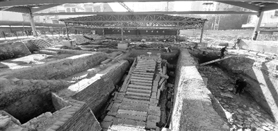 温州朔门古港遗址发掘区主要由西端南侧瓮城区、中部邻江港口区及东端水门头区三部分组成。我们沿着由西向东的路线参观,瓮城区发现早、晚两期瓮城基址及砖、石道路等遗迹。宋元时期瓮城城墙平面呈圆弧形,石壁土心,基址厚4米;明清时期改为方形,内外壁以条石垒砌,基址厚5.3米。瓮城外发现有三个时期道路及多条排水沟遗迹。